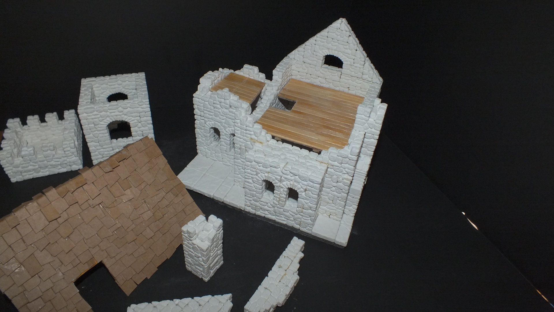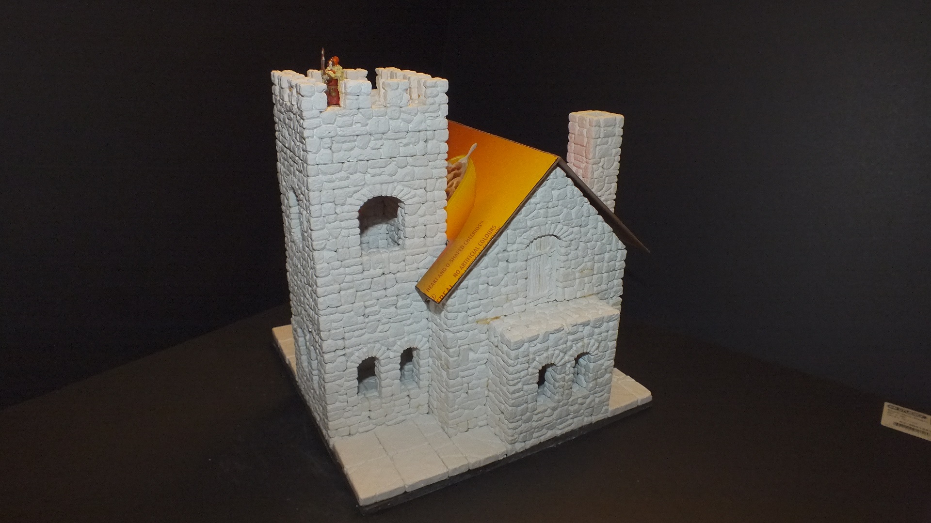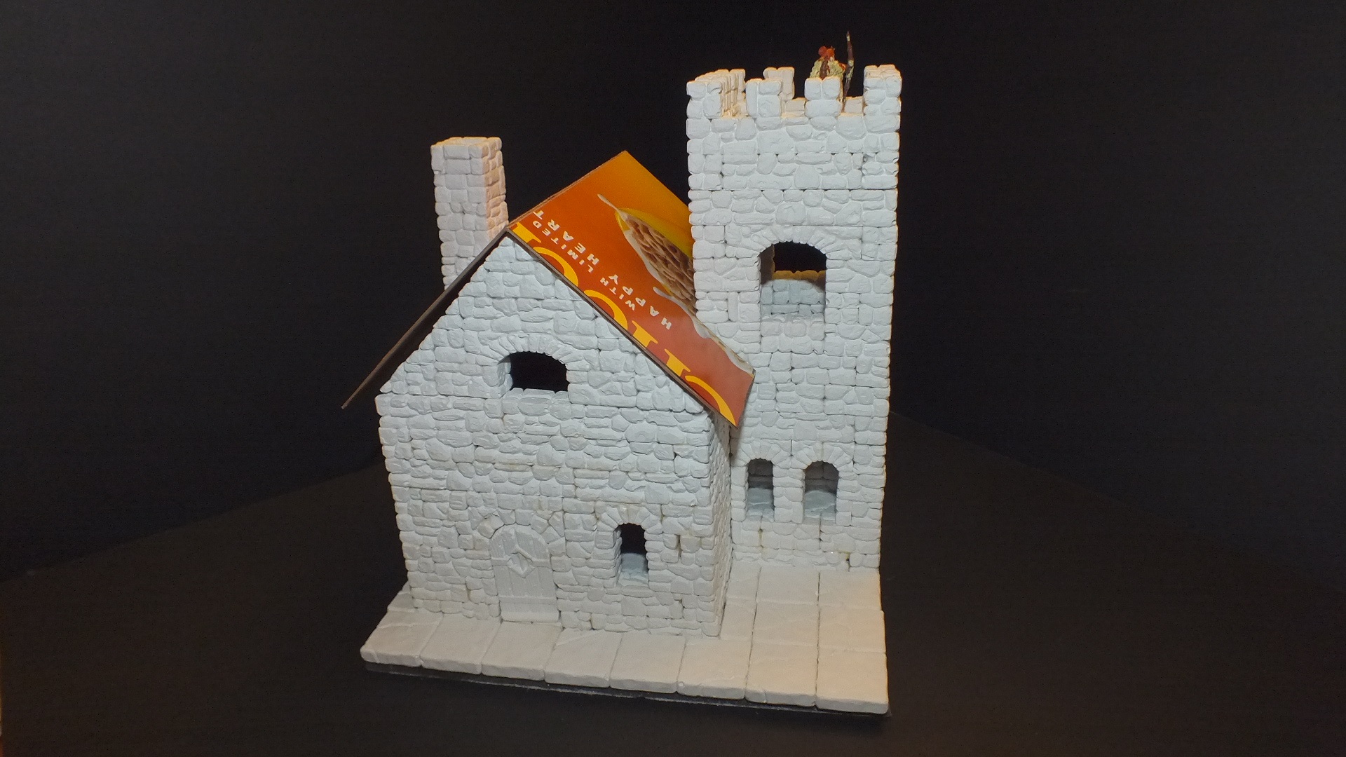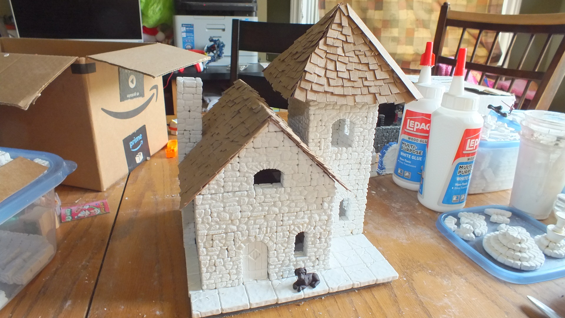 Made from Plaster of Paris, cardboard roof and shingles, with cardboard and pogo sticks for the wood floors.