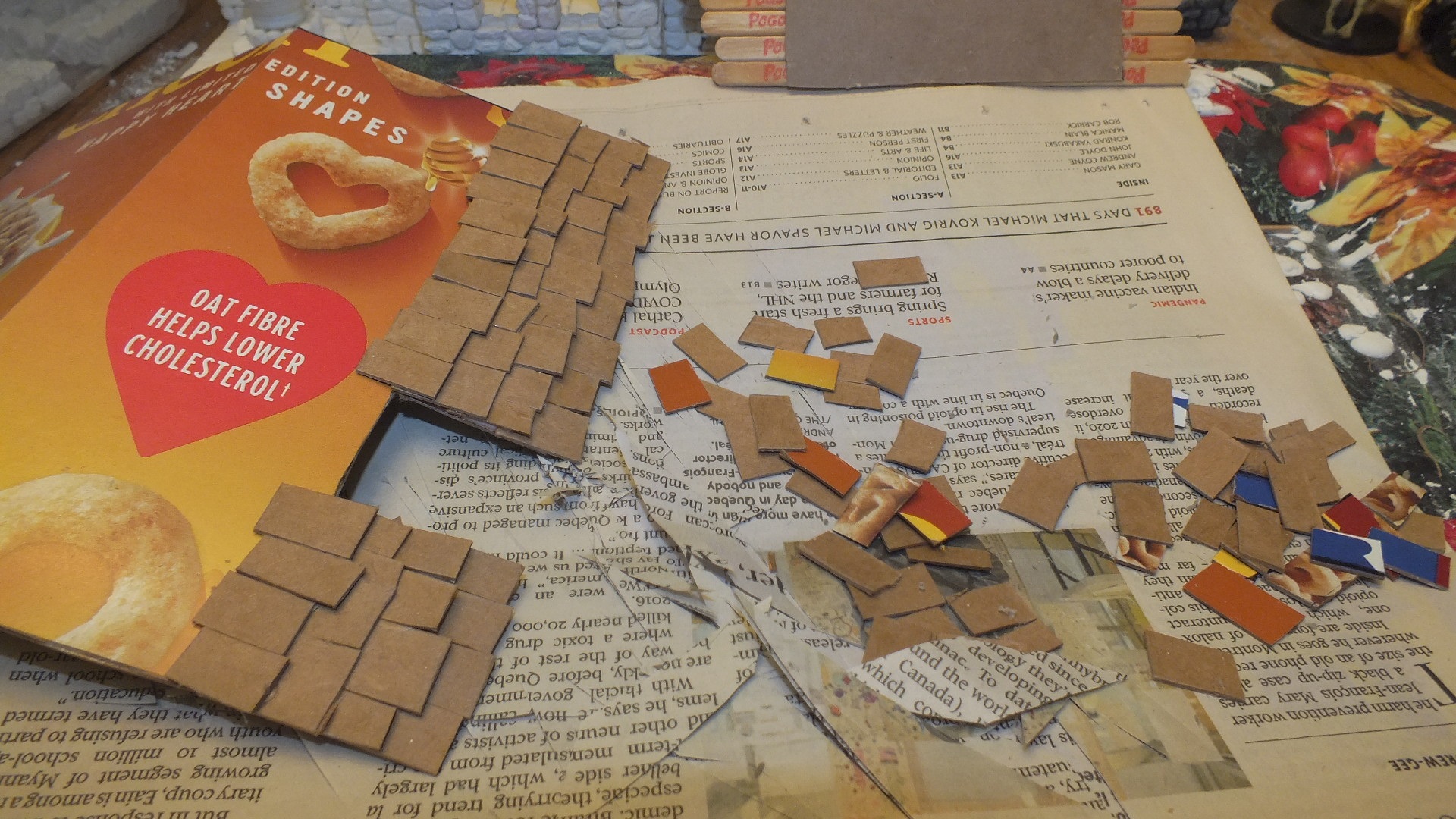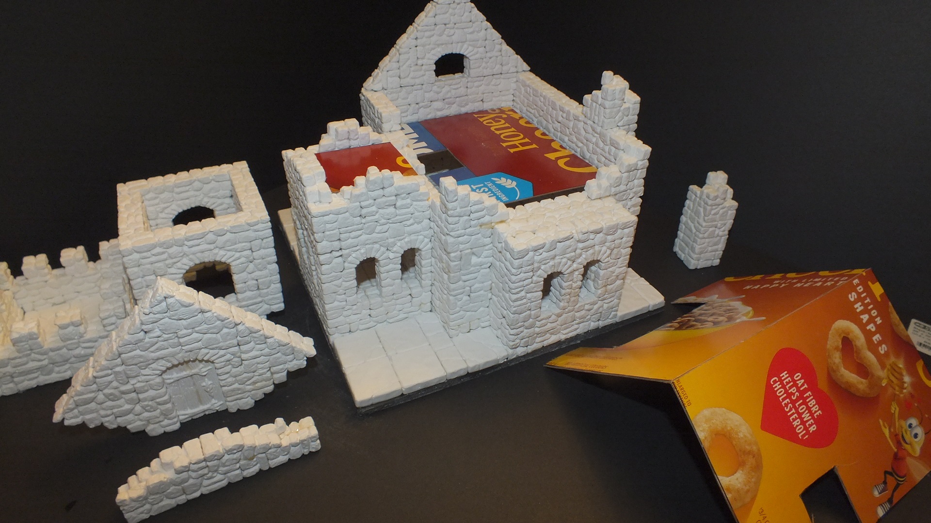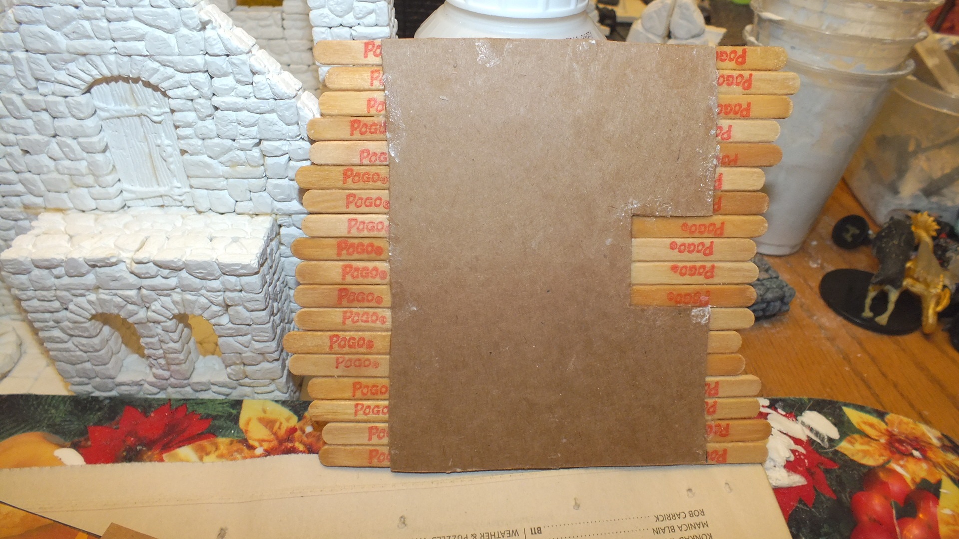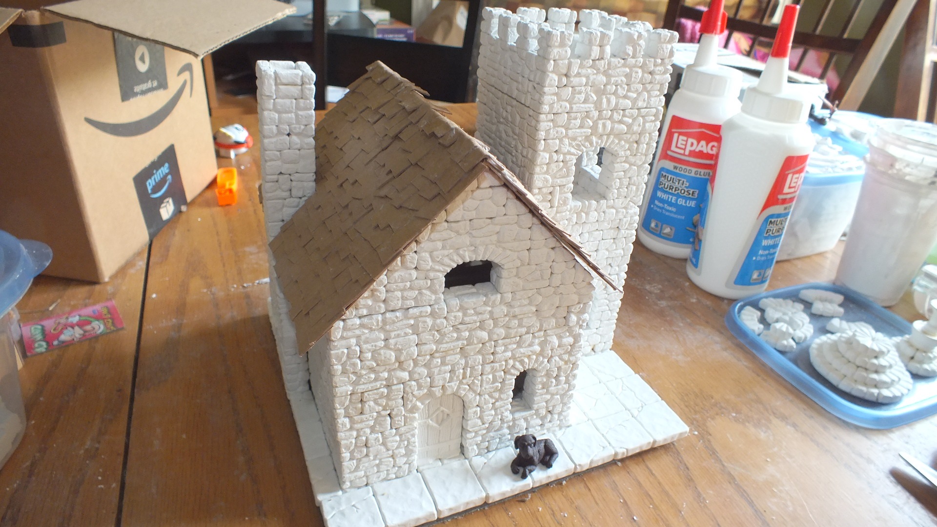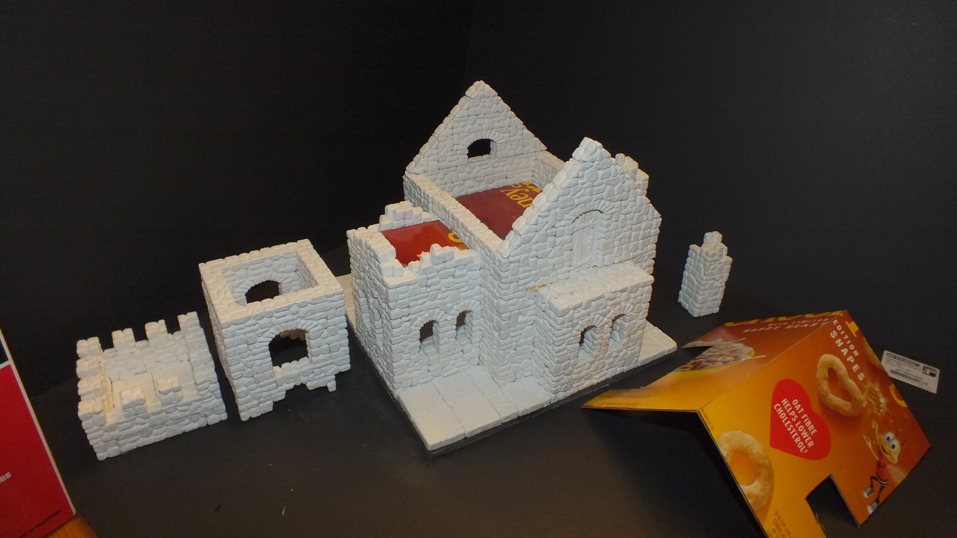Made from Plaster of Paris, cardboard roof and shingles, with cardboard and pogo sticks for the wood floors.