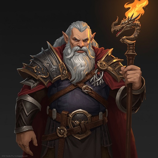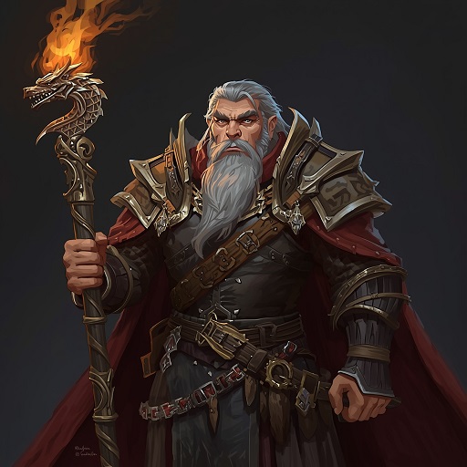 Morgrym, now 53, stands at 4 feet 6 inches tall, his stocky, muscular form a product of his dwarven heritage. However, his once-proud appearance has become somewhat unsettling. His skin is an unnatural pallor, his veins occasionally glowing faintly with a sickly green hue. His gray-black, ink-like hair seems to shift unnaturally in the light, and his beard, though long and thick, moves as though alive, with dark tendrils that seem to sway on their own. His once gleaming armor has dulled, marred by deep scratches and burn marks from eldritch forces he's harnessed. His eyes, once a warm brown, are now darkened, deep black voids with the same abyssal blackness that filled the depths of the ocean. His mind, once sharp and clear, began to bend and twist under the weight of the eldritch influence.