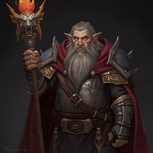 Morgrym, now 53, stands at 4 feet 6 inches tall, his stocky, muscular form a product of his dwarven heritage. However, his once-proud appearance has become somewhat unsettling. His skin is an unnatural pallor, his veins occasionally glowing faintly with a sickly green hue. His gray-black, ink-like hair seems to shift unnaturally in the light, and his beard, though long and thick, moves as though alive, with dark tendrils that seem to sway on their own. His once gleaming armor has dulled, marred by deep scratches and burn marks from eldritch forces he's harnessed. His eyes, once a warm brown, are now darkened, deep black voids with the same abyssal blackness that filled the depths of the ocean. His mind, once sharp and clear, began to bend and twist under the weight of the eldritch influence.