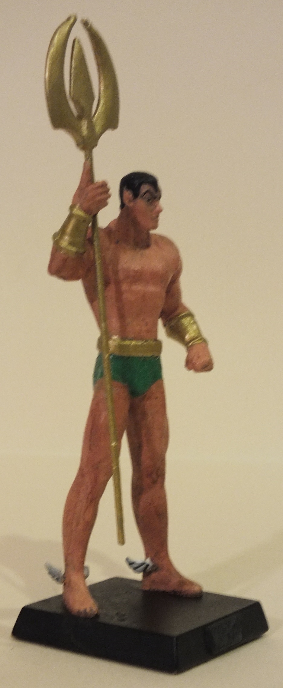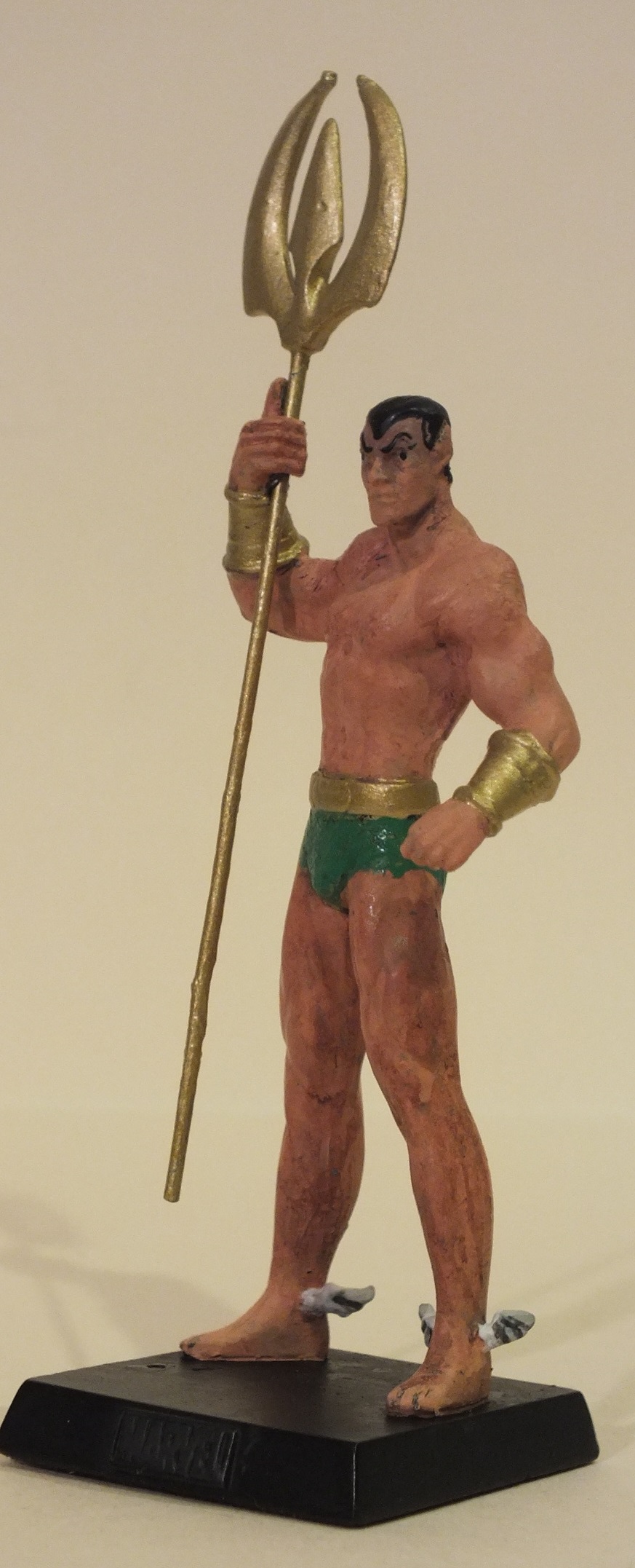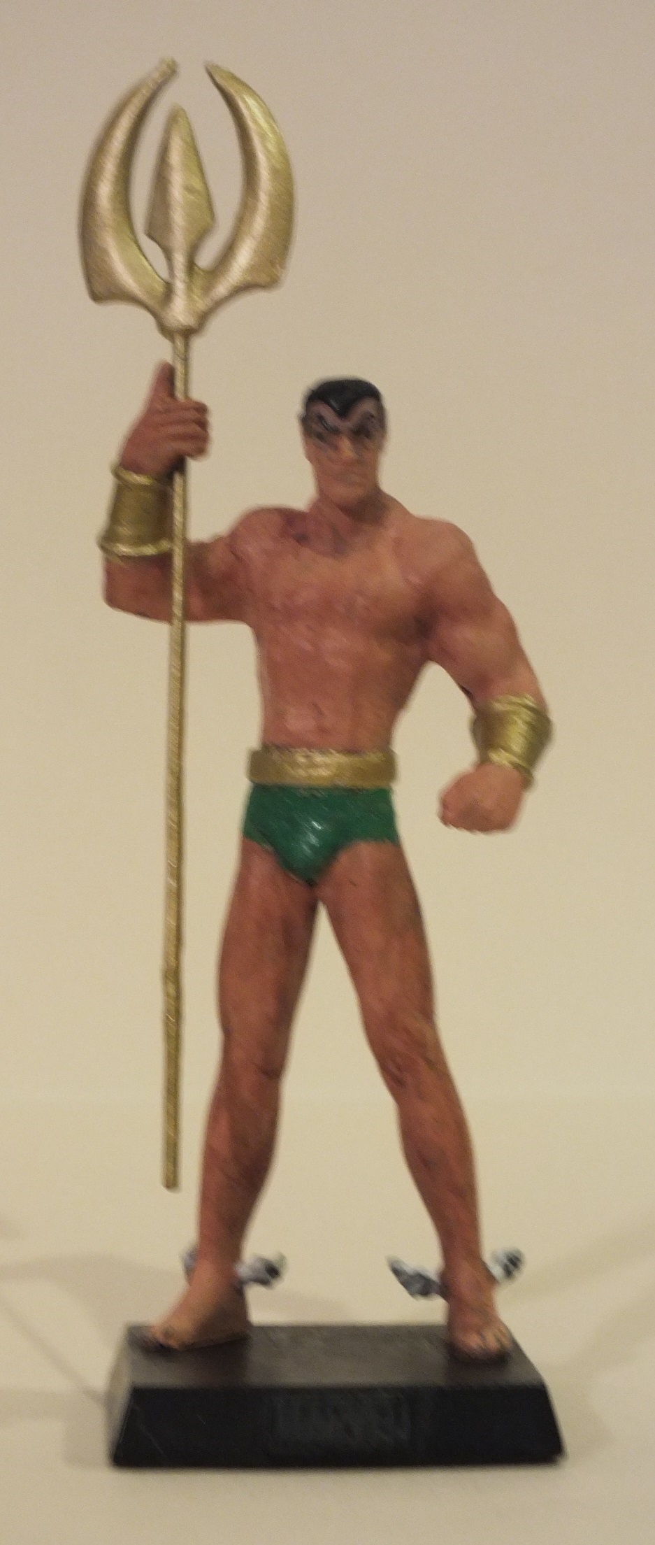 Used the Marvel Namor as the base figure, but wanted to change his costume. The hard part was wittling away at the shoulder pads with an exacto knife, as well as cutting away his underarm fins. After that it was reversing the way he holds his trident, and then painting on his classic costume.