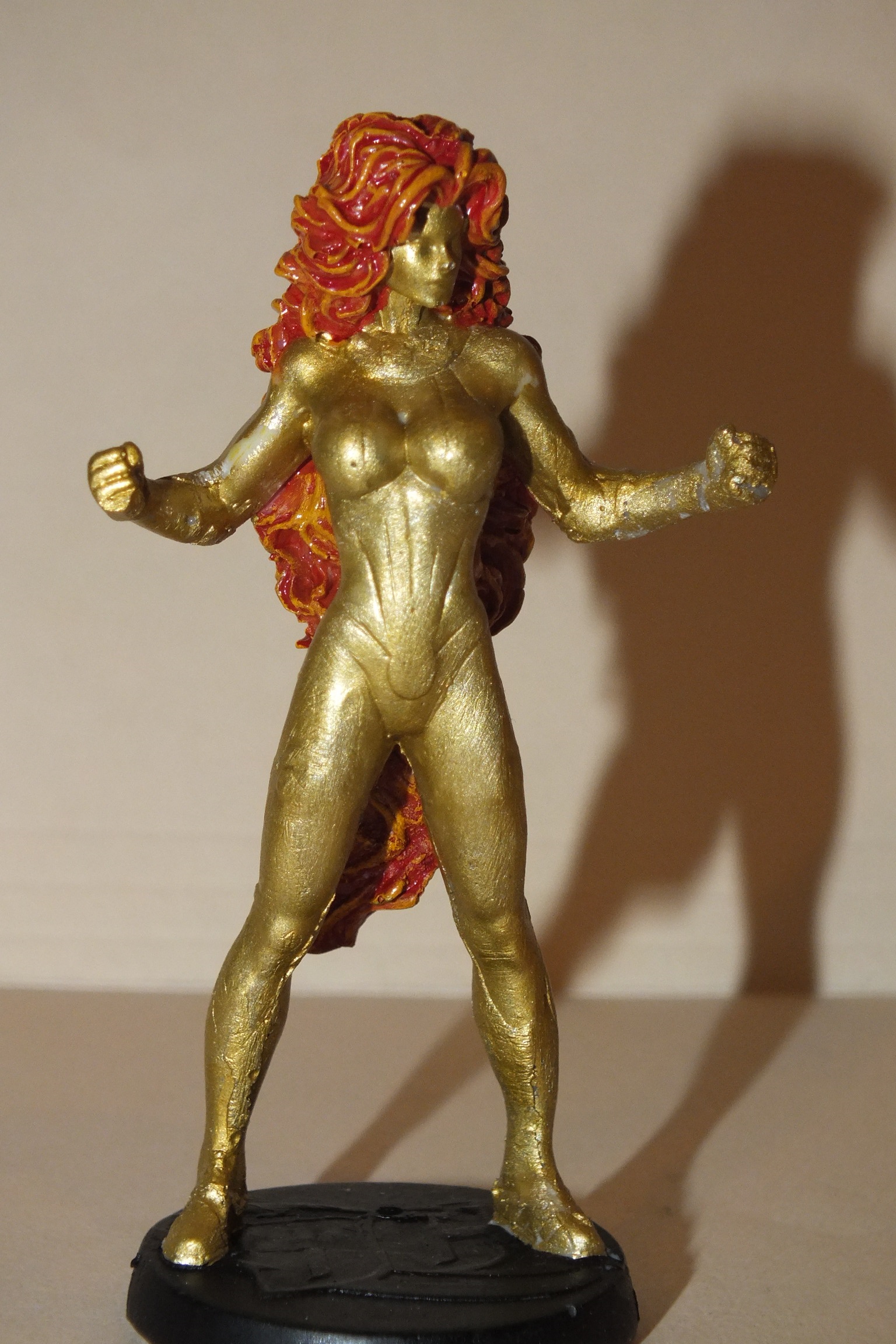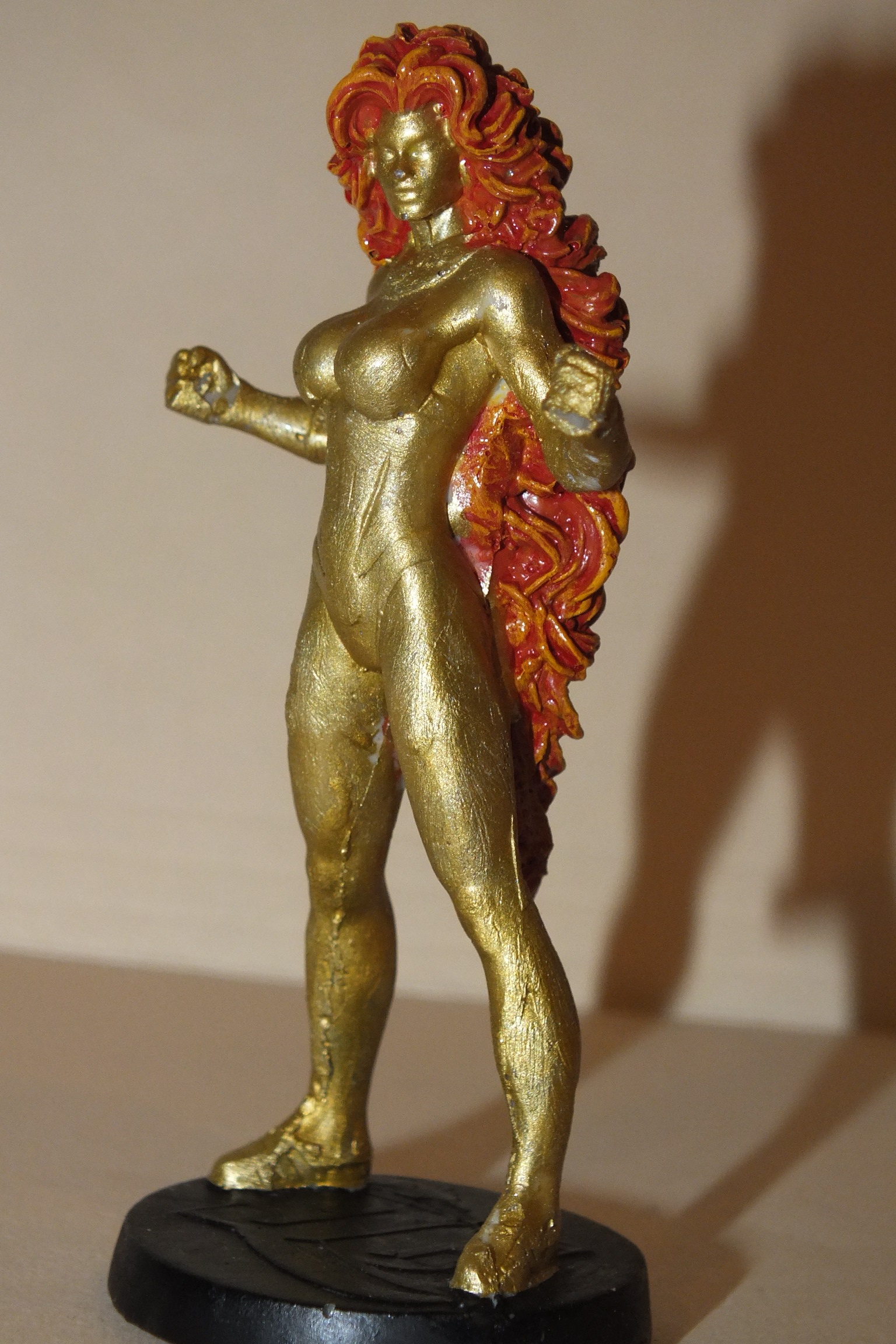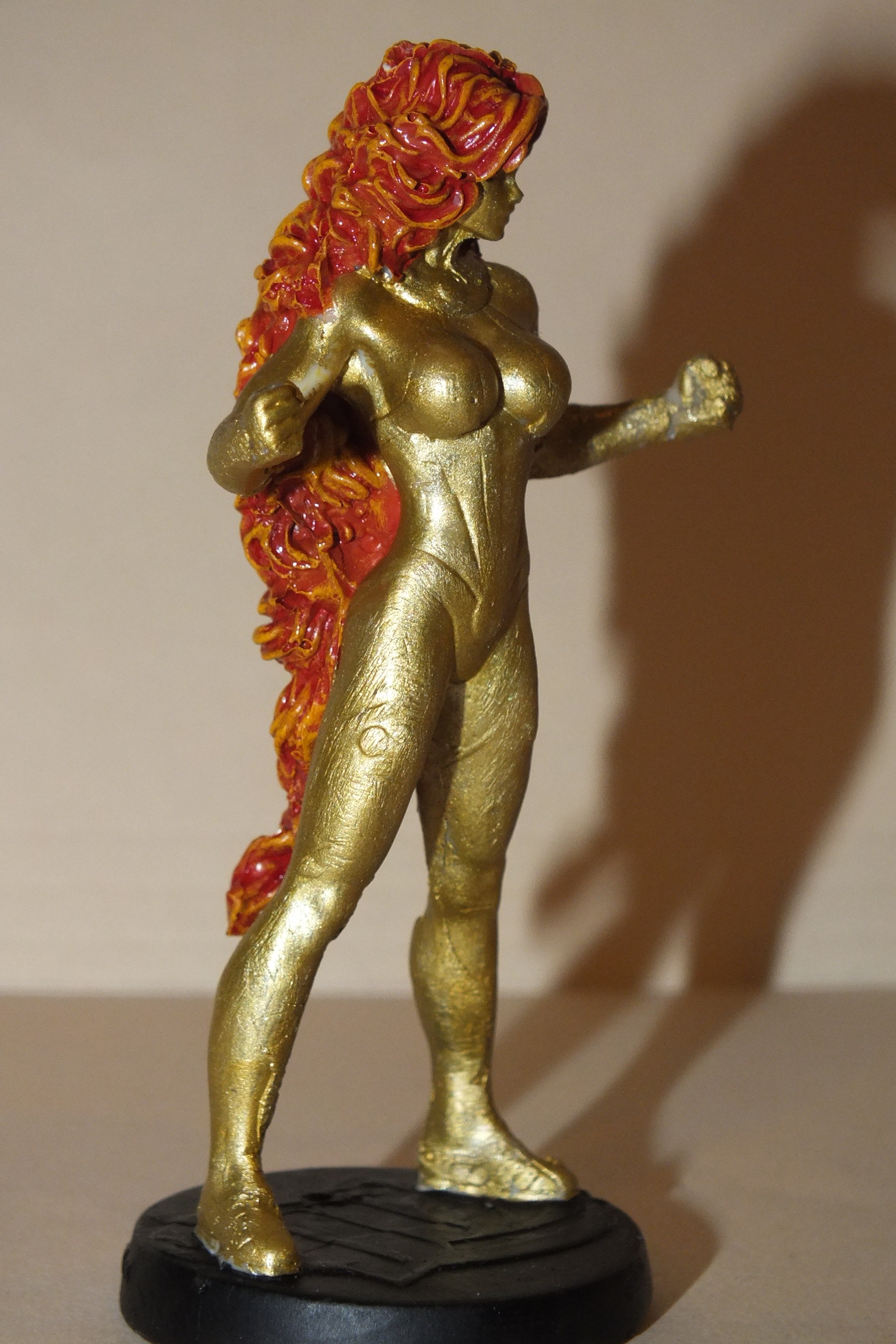 Made a rubber mold using the Starfire figurine. I then poured resin in, which was ready to go after 15 minutes. After, I proceeded to paint with gold. To get the flame effect on hair used an orange base, then a red wash, followed by a dry brush of yellow to provide highlights.