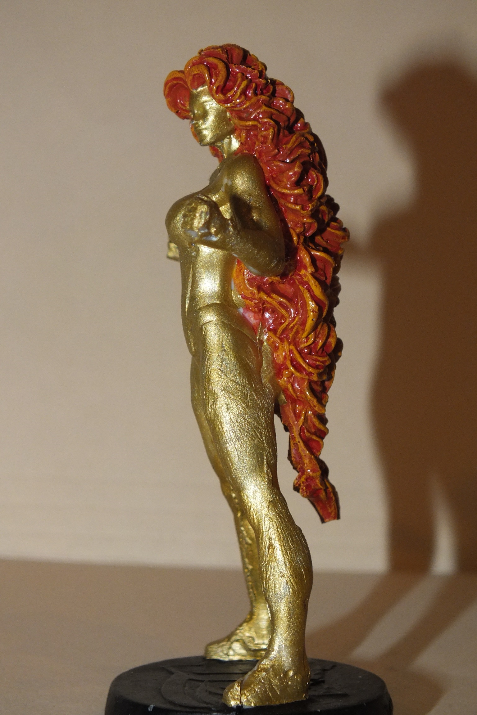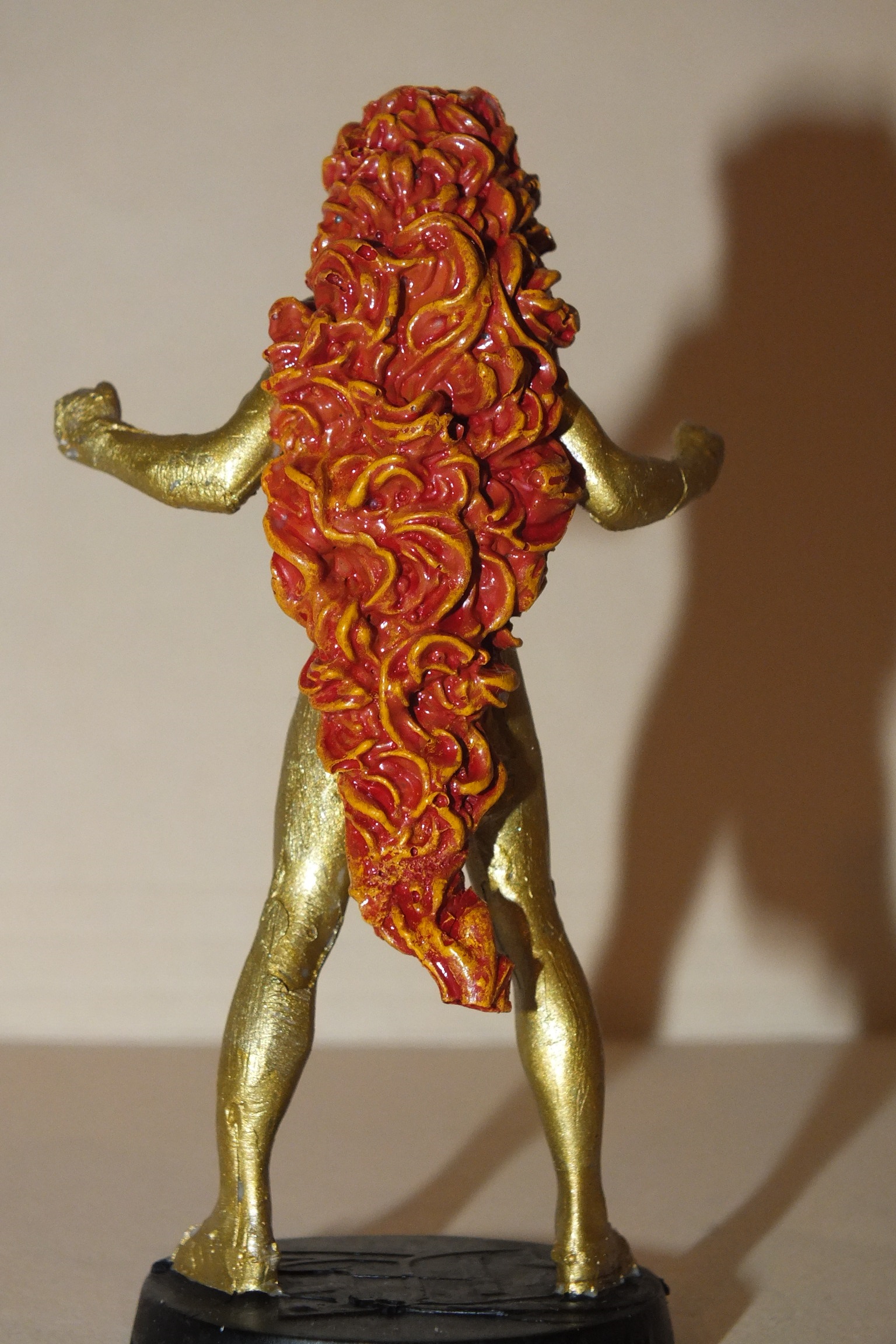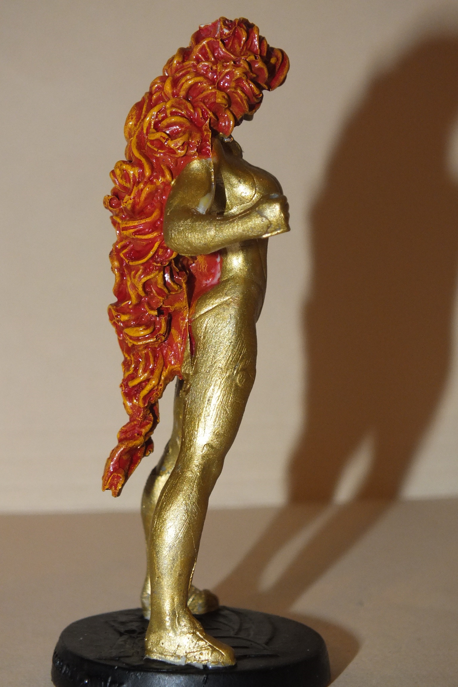 Made a rubber mold using the Starfire figurine. I then poured resin in, which was ready to go after 15 minutes. After, I proceeded to paint with gold. To get the flame effect on hair used an orange base, then a red wash, followed by a dry brush of yellow to provide highlights.