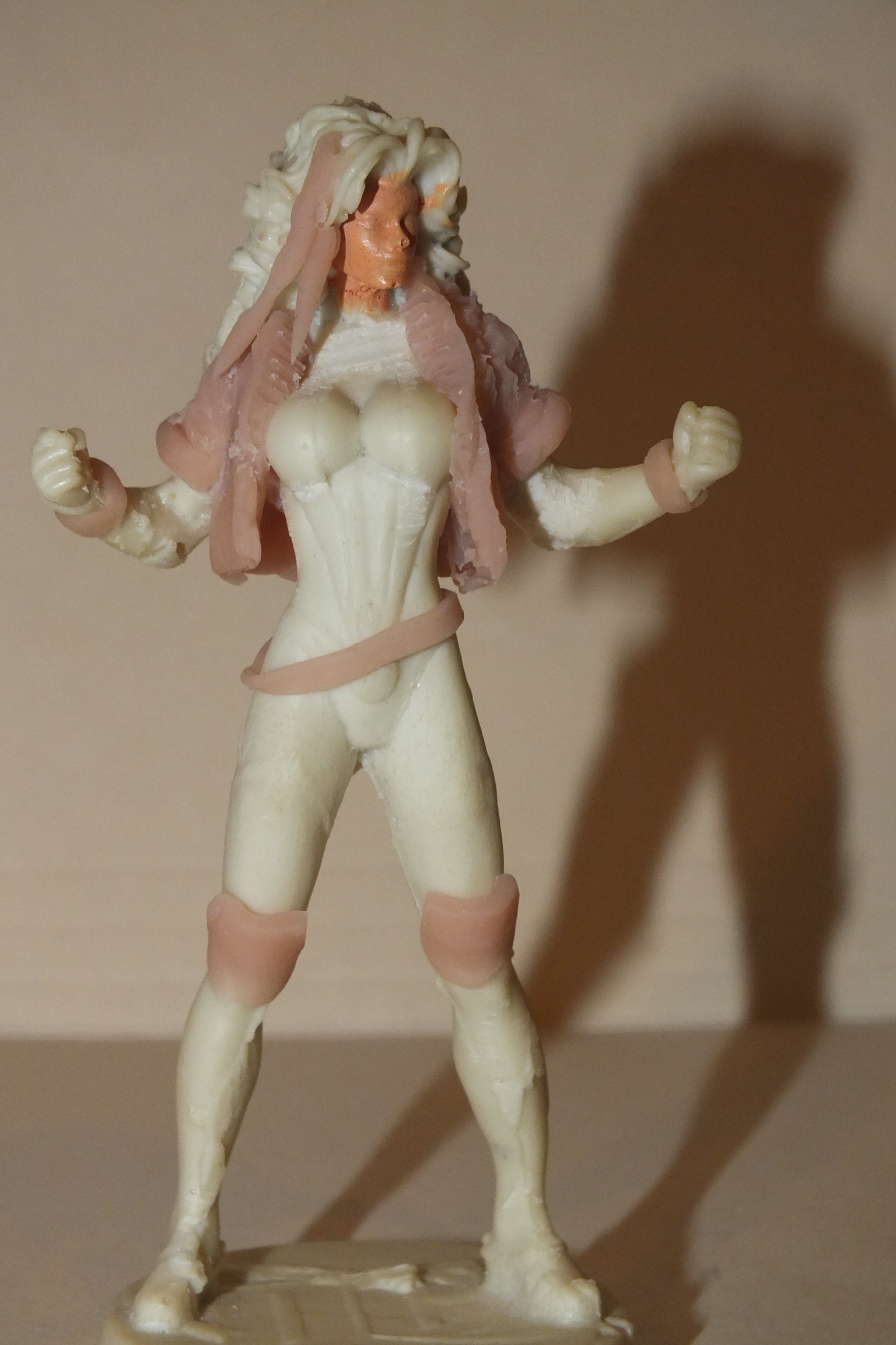 Made a rubber mold using the Starfire figurine. Had to block some of the long hair in the mold using Super Sculptey in order to get the shorter hair. I then poured resin in, which was ready to go after 15 minutes. Used Super Sculptey to provide details for her costume. After baking, I proceeded to paint.