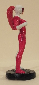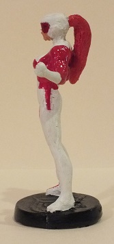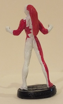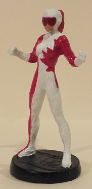 Made a rubber mold using the Starfire figurine. Used SuperSculpey to block Starfire's hair in the mold. I then poured resin in, which was ready to go after 15 minutes. Had to use SuperSculpey to mold her back, head, and hair into a ponytail. After baking, I proceeded to paint. The Maple Leaf design was tricky to do. I then made her red goggles using some red plastic from one of those red/blue 3-D glasses.