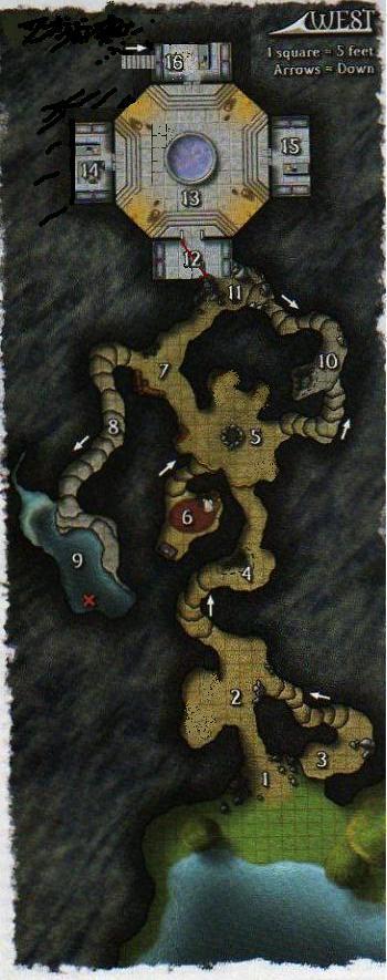 "The constant thunder of a ten-foot waterfall at teh northwestern end of this humid cavern fills this chamber with sound. A ledge of weathered shale along the eastern side overlooks a deep-looking subterraneon pool. A steady inflow of water from a narrow fissure feeds the cascade and the pool, but no exit channel for the pool is visible. The only other entrance appears to be a natural staircase of rock the climbs away to the north."
